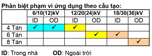 - Chịu được điện áp định mức từ 5 đến 35kV. Có điện áp xung định mức 110kV